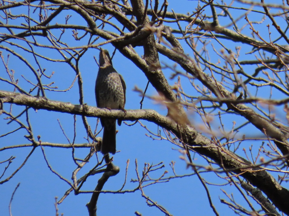 今回も近所の緑地公園へ行ってきたのですが、休日ということもあり家族連れでかなり賑わっていて、さらに風が強くて野鳥の鳴き声が聞き取りづらく、ほとんど目視で確認できない有様で散々でした。そんな時、小さな野鳥はどこかでひっそり休んでいたのかもしれません。そんな中で1回だけシャッターチャンスがあり、その1回で撮った写真をご覧ください。うなだれて帰ってきたのでかなり希望的観測で申し訳ありません、画像検索ではヒヨドリと出るのですが、ツグミの線が濃厚ではないかと思っています。