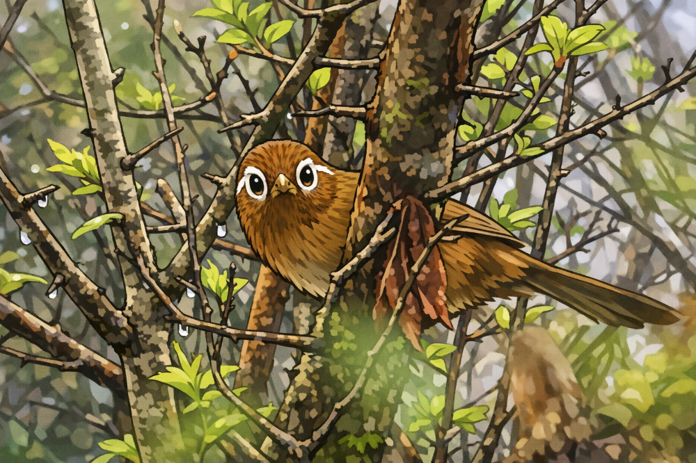 今回も近所の緑地公園に行ってきたのですが、途中から雨が本降りになり写真どころでは無くなってしまいました。それでもたまたま撮った1枚の写真がまさに“What’s going on”だったのでまたまたCOPILOTに聞いてみました。COPILOTは写真を見せるとそれによって質問に回答してくれる機能もあったのでした(実は最近知ったのですが)。写っているのはガビチョウです。ガビチョウは特定外来生物に指定されており、ツグミ、シロハラ、アカハラといった地上採食性のヒタキ科鳥類のニッチに相当し、それらを駆逐したり、行動範囲がウグイスとその近縁種と重なり、ウグイスの減少をもたらしたりするため、生態系への影響も懸念されていますが、注目はそこではありません・・・。今回の写真は顔の正面から撮影しているのですが、なぜかガビチョウの目が正面を向いているように見えないでしょうか?猛禽類などの鳥類は肉食なので顔の正面に目がついているのですが、それ以外の野鳥では目は横についているのが通常だと思っていました。しかし写真をみるとどうみても真正面からガビチョウがこちらをみているように見えます。ガビチョウの突然変異?何かの理由で進化した???。COPILOTの解答は結論からいうと目の錯覚でした。理由1、白いアイリングが“目の位置“を中央に引き寄せてみせる。理由2、頭部が丸く、横の目でも正面から見える。理由3、光の反射が“前向きの目“を強調している。理由4、ガビチョウはもともと“やや前寄り“の目の配置。以上がその理由であり、進化的な変化、突然変異、異常な配置は写真から一切感じられず、典型的なガビチョウでした。ですがCOPILOTはフローもちゃんとしてくれます、ガビチョウは、藪の中での生活、仲間とのコミュニケーション、捕食者の警戒などのために、横の視野と前方の深度感の“中間“のような視覚構造を持っています。その曖昧な位置関係が、正面に目があるように見えさせる理由であり、そう感じたことは鋭い観察と言えます。・・・・だそうです(やさしい・・・)。正面から写ったすっとぼけたガビチョウの写真と優しいCOPILOTがそれをイラストにしてくれましたのでご覧ください。